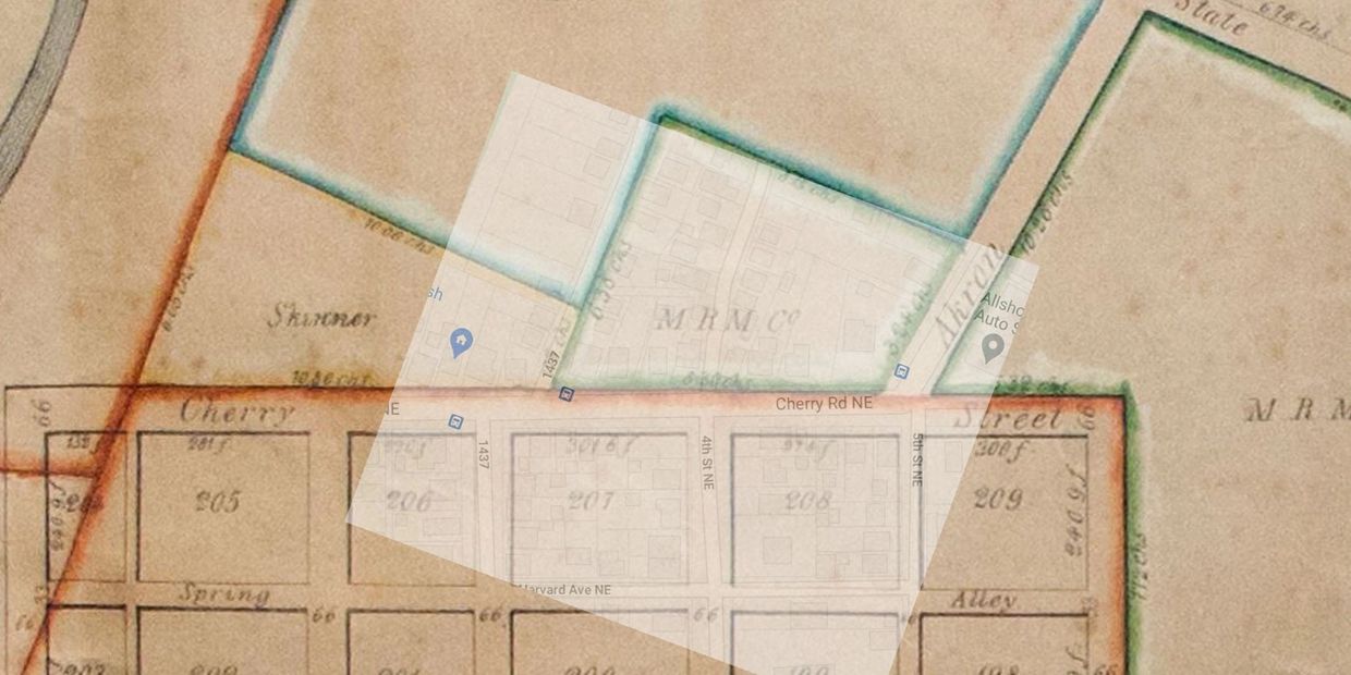 The 1837 Massillon Map shows an empty lot labeled “Skinner” along "Cherry Street" (today known as Cherry Rd NE) opposite "East Street" (today known as 3rd St NE). This may be a lack of details of structures or evidence that no structures existed.